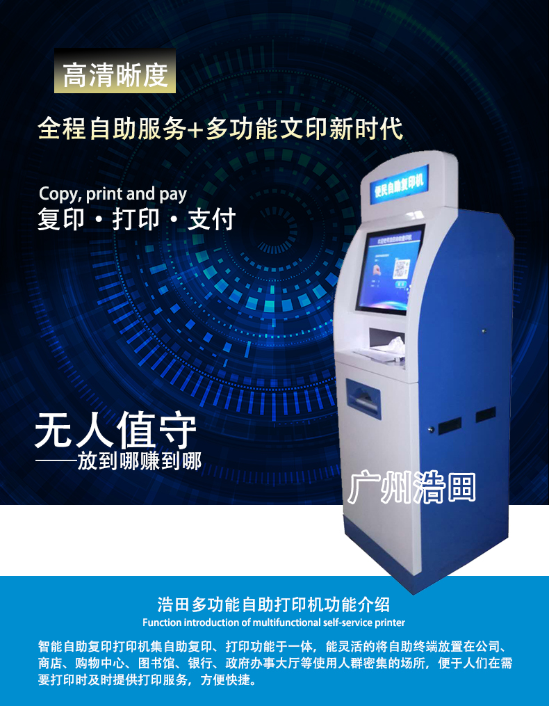 浩田自助打印機怎么使用?它真正實現(xiàn)了無人化管理,實使用校園卡/投幣/微信掃碼支付即可完成復(fù)印文件支付,宿舍大樓自助打印機打破了傳統(tǒng)復(fù)印店的壟斷,受到師生們的歡迎。